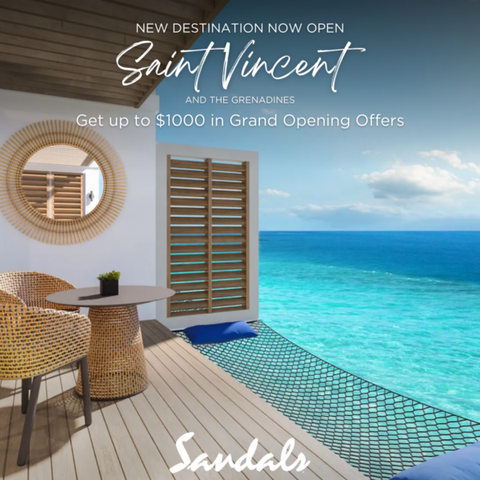 Discover your slice of paradise at the brand-new Sandals St. Vincent and The Grenadines! Dive into luxury with private villas, overwater bungalows, and stunning pools. Book now and enjoy up to $1000 in Grand Opening Offers!